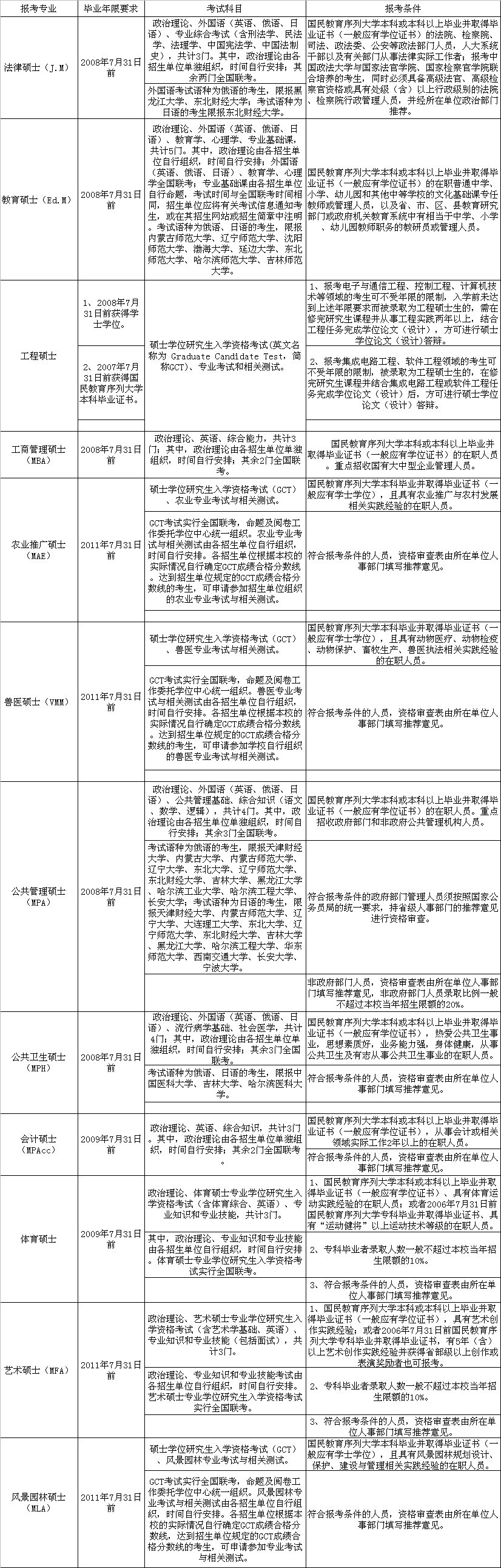11年十月联考专业报考条件、科目