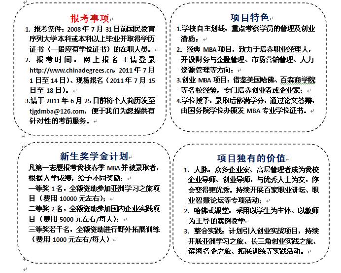 欲知更多详情,请参加招生沟通会,内容:1.解读项目内涵及最新招生政策;2. 专题讲座“攻读MBA与职业成功”(由名师主讲)。时间:2011年6月26日上午9:30;地址:天津工业大学老校区教学主楼一层MBA教育中心(河东区成林道)