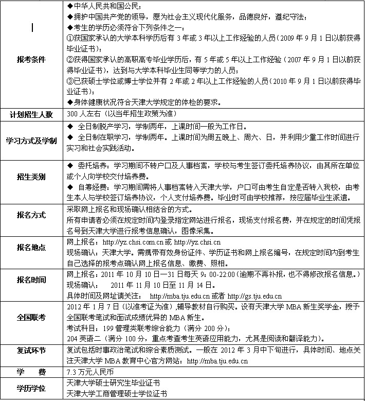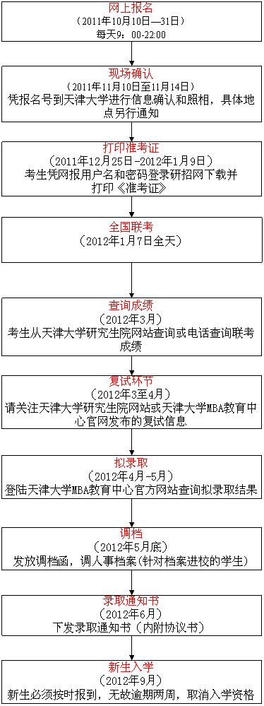 2.凡报考天津大学MBA的考生必须按规定时间在网上提交报名信息,并到天津大学进行现场交费、照相、确认网报信息,未现场确认信息者网上报名无效。
